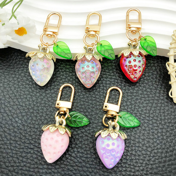Portachiavi in acrilico con foglia verde fragola carina all'ingrosso semplice divertente ornamento di frutta portachiavi borsa ciondolo gioielli di moda